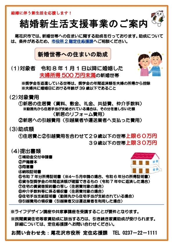- 賃料については、「民間賃貸住宅等家賃助成事業」の要件を満たした場合、引き続き助成を受けることができます。詳細については、尾花沢市役所 定住応援課へお問い合わせください。